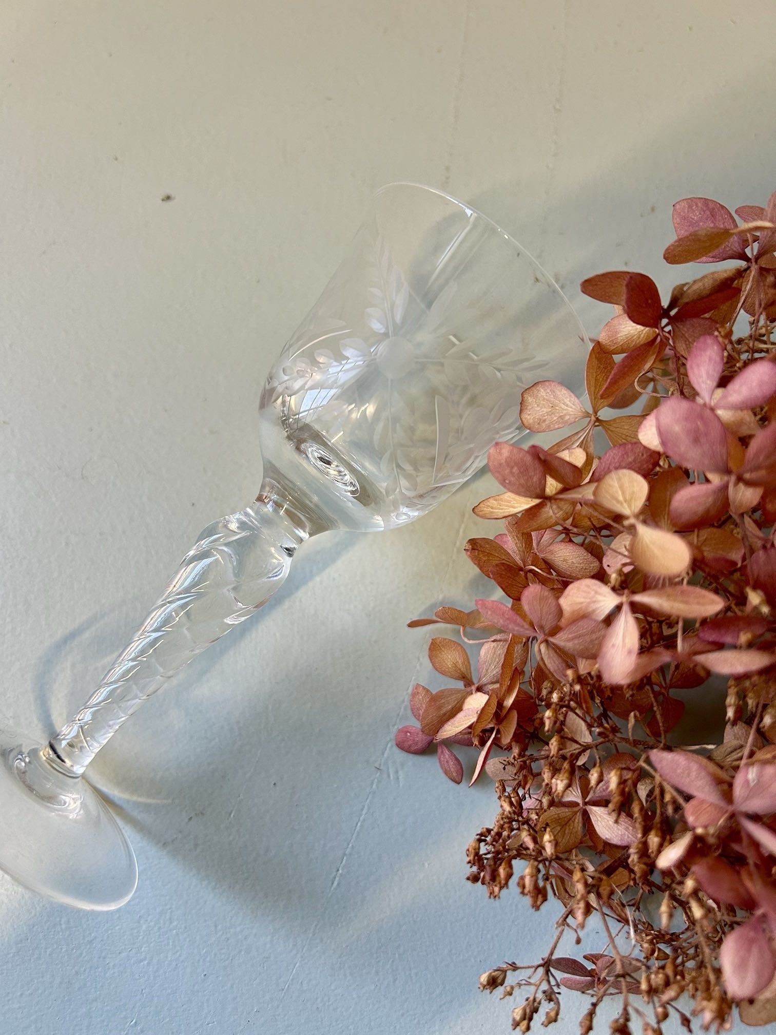 Lot de six verres à digestif en cristal gravé, au décor floral gravé, à la fois sobre et intemporel.Leur petit format est idéal en fin de repas, mais ils peuvent aussi être détournés pour servir un café allongé, un sirop ou une liqueur maison, sur une table moderne ou dépareillée.