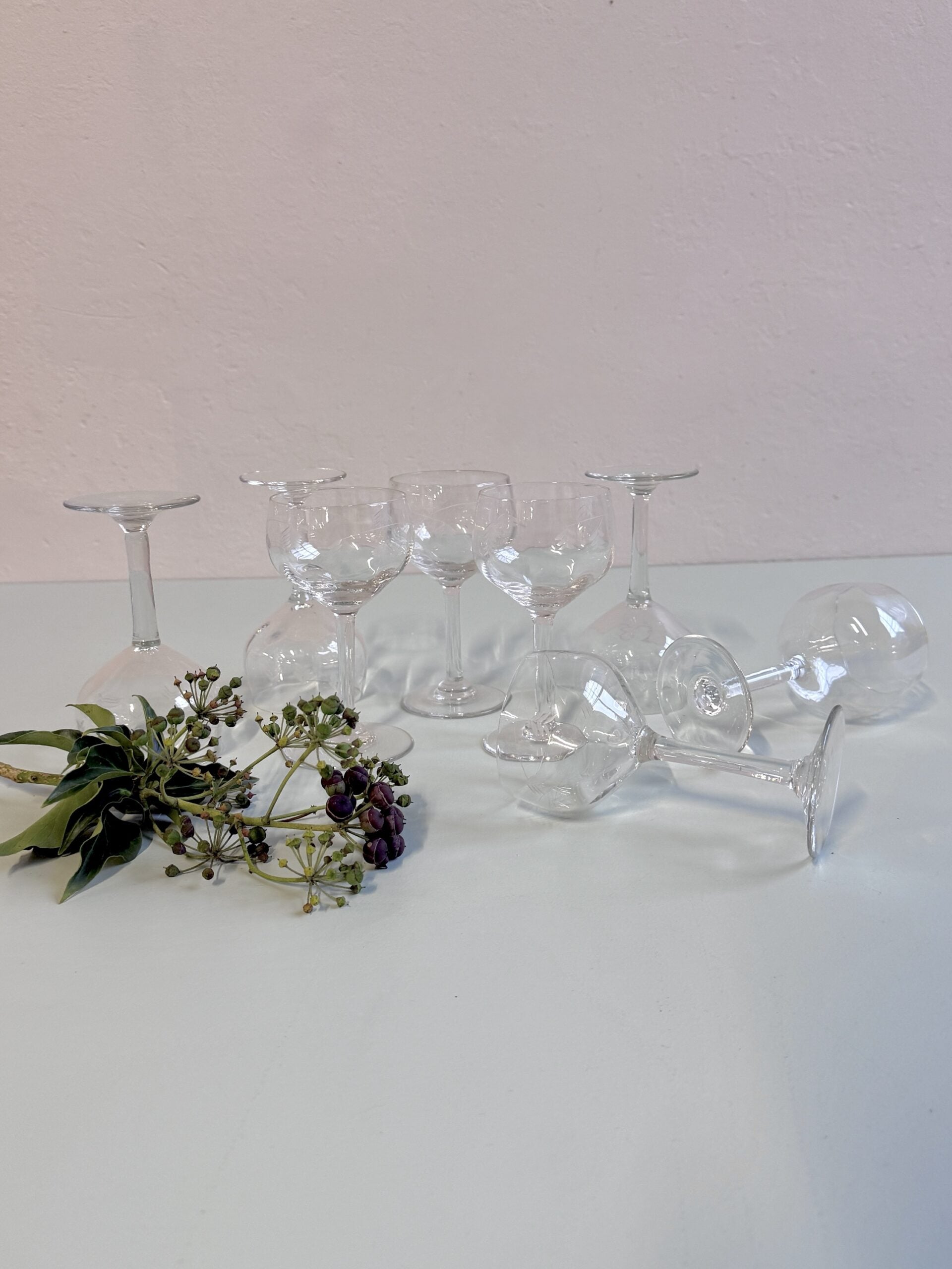 Lot de 8 verres à pied anciens en verre transparent, décorés d’une gravure délicate en guirlande avec épis de blé. Une forme simple et bien équilibrée, facile à sortir au quotidien comme pour une table un peu plus soignée. À mixer sans problème avec d’autres verres anciens pour une table vivante et pas trop stricte.Détails & caractéristiques