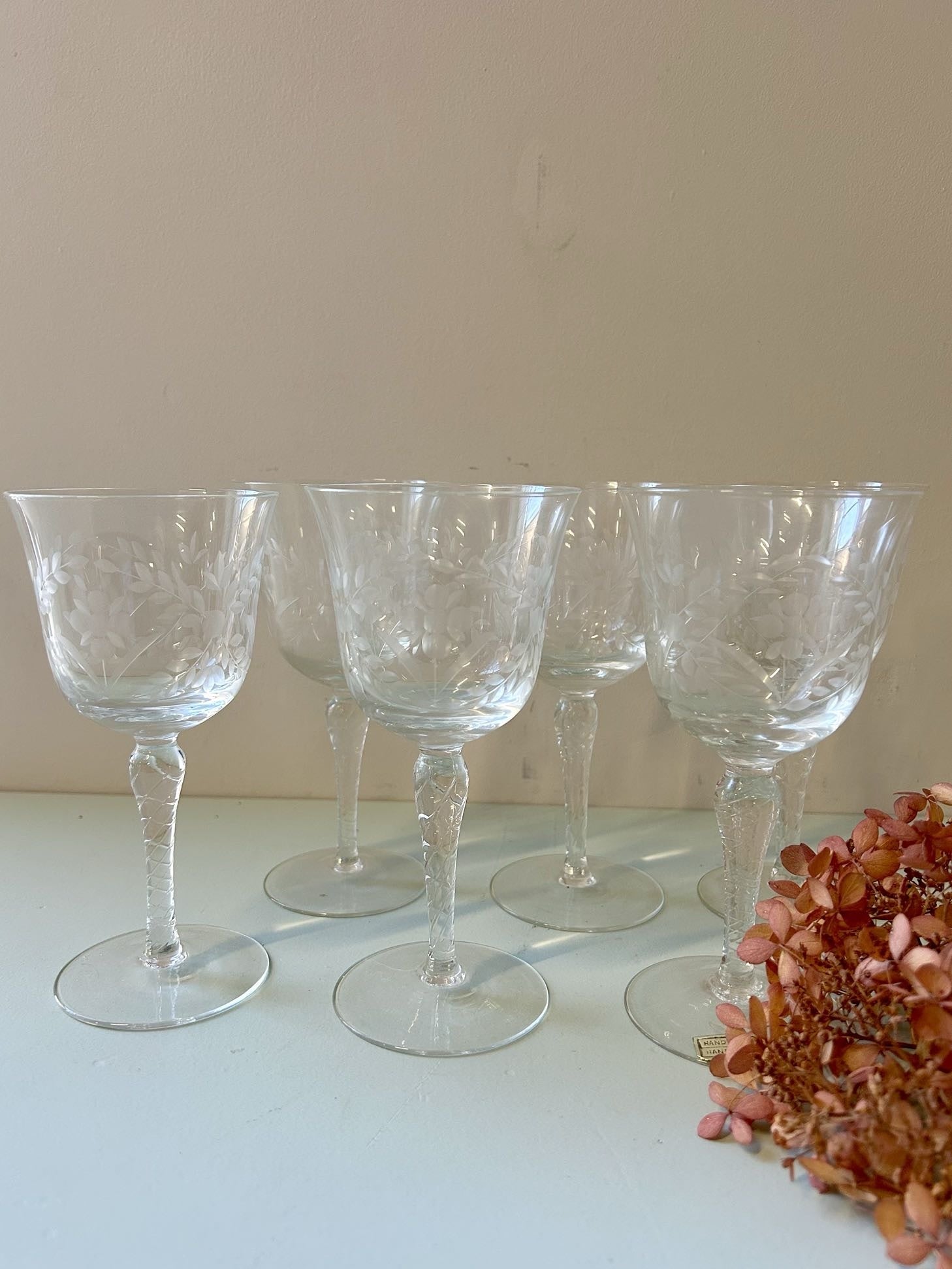 Lot de six verres à vin en cristal gravé, au décor floral gravé à l’acide, discret et élégant, typique de la verrerie ancienne.Ils trouvent facilement leur place sur une table contemporaine, associés à de la vaisselle sobre, du lin naturel ou une nappe unie. Un bel équilibre entre ancien et actuel, pour une table simple mais soignée.