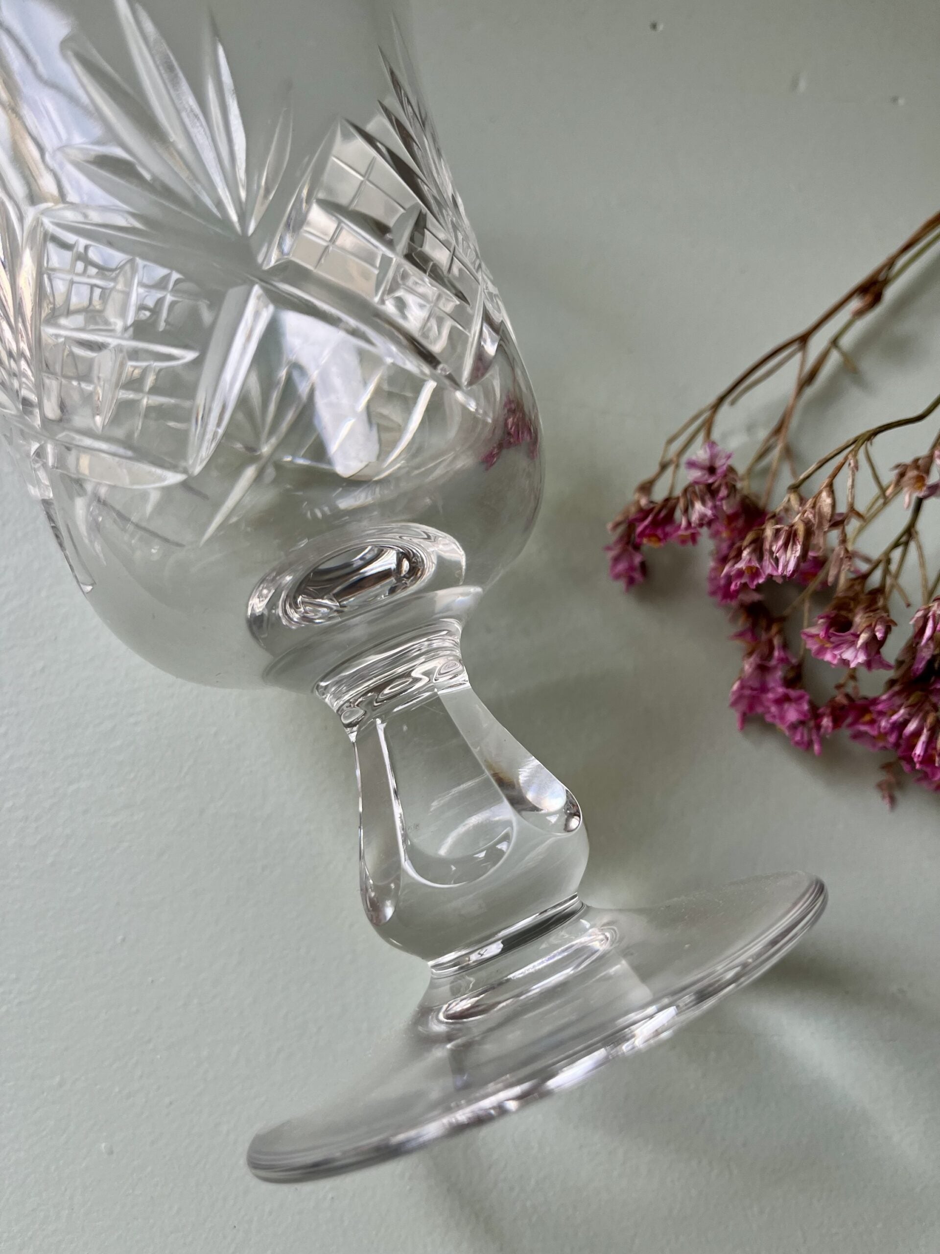 Lot de verres à vin en cristal taillé fait main, avec mention visible sur le pied. Le décor gravé géométrique et étoilé, typique de la cristallerie ancienne, capte la lumière et met en valeur la brillance du cristal ancien.
