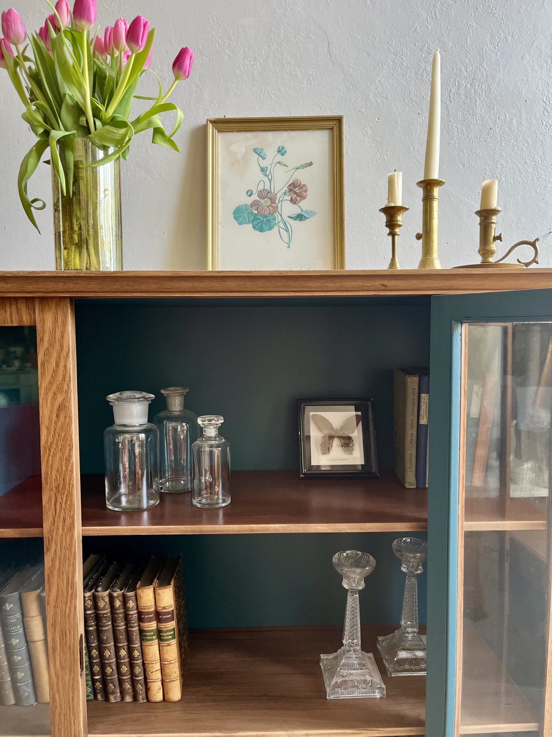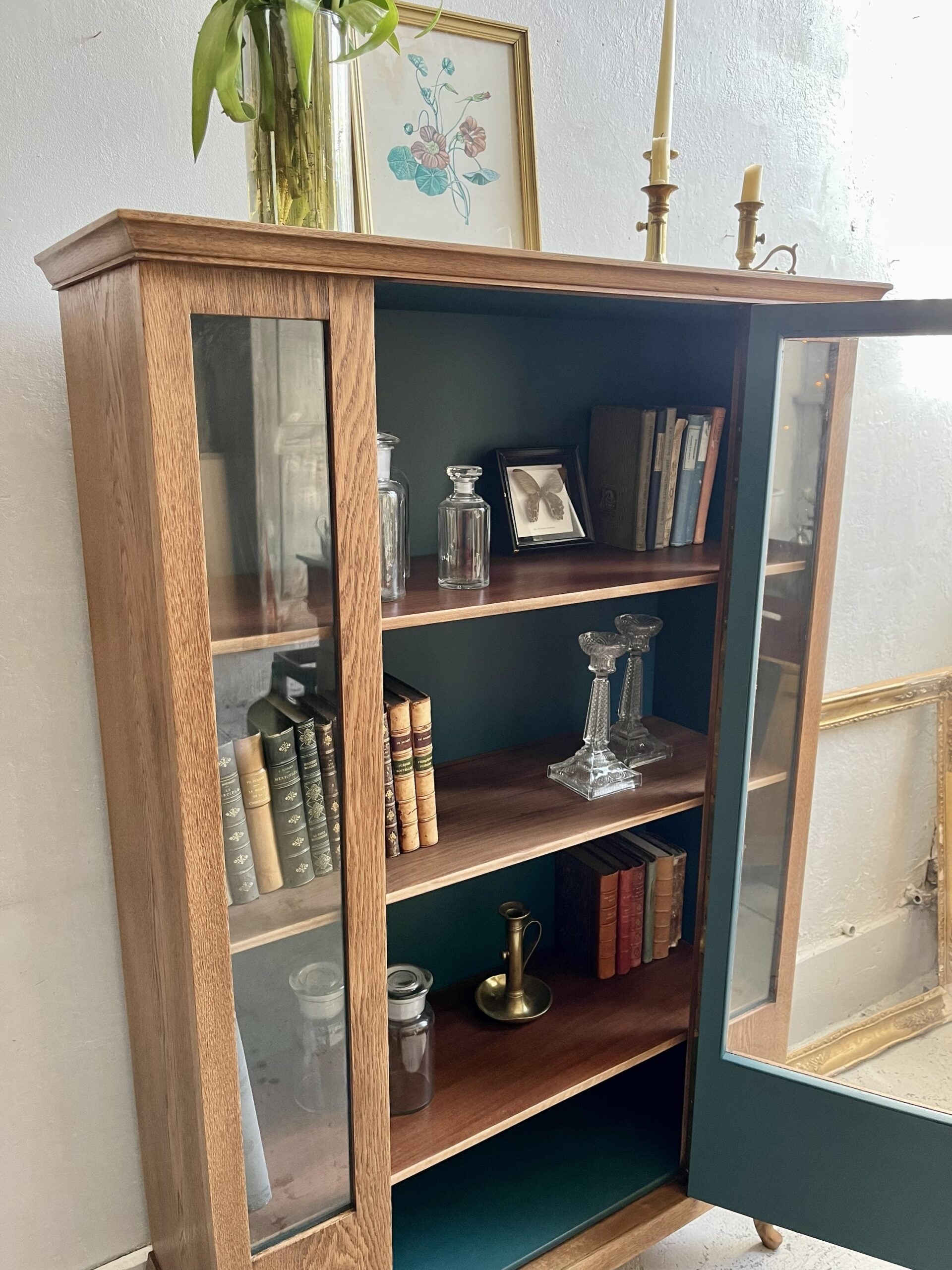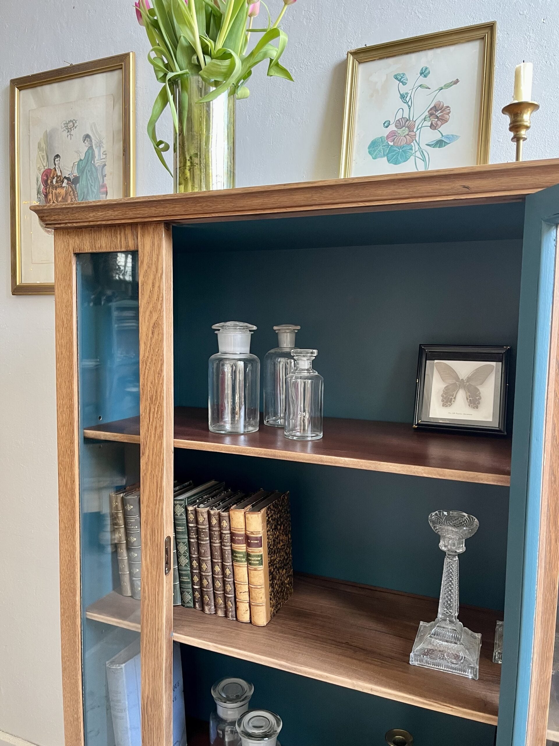 Vitrine ancienne remise au goût du jour tout en conservant son esprit d’origine. La teinte noisette réchauffe le bois et met en valeur son veinage, tandis que le bleu Terre de Fer à l’intérieur apporte de la profondeur et souligne les objets exposés. Jolie bibliothèque pour livres ou vitrine pour la vaisselle et les objets anciens. Un meuble qui trouve facilement sa place dans une pièce de vie en lui apportant une vraie identité.
