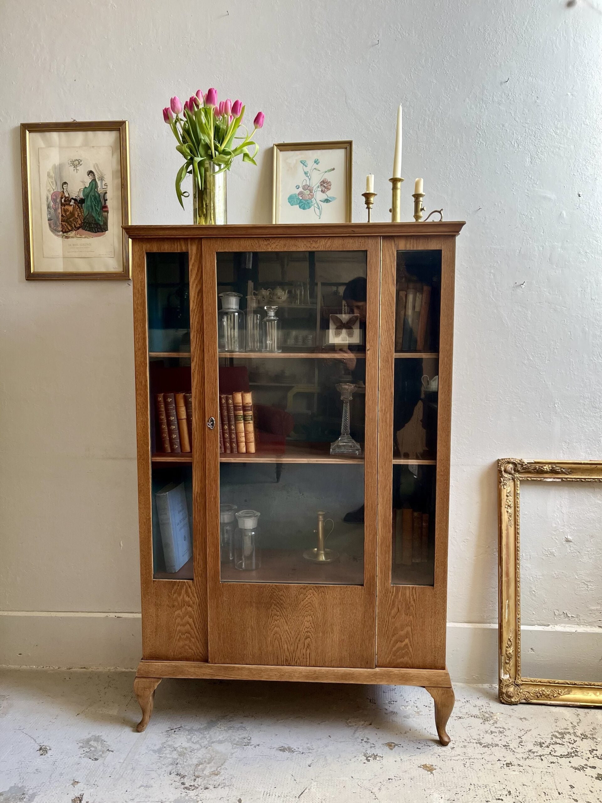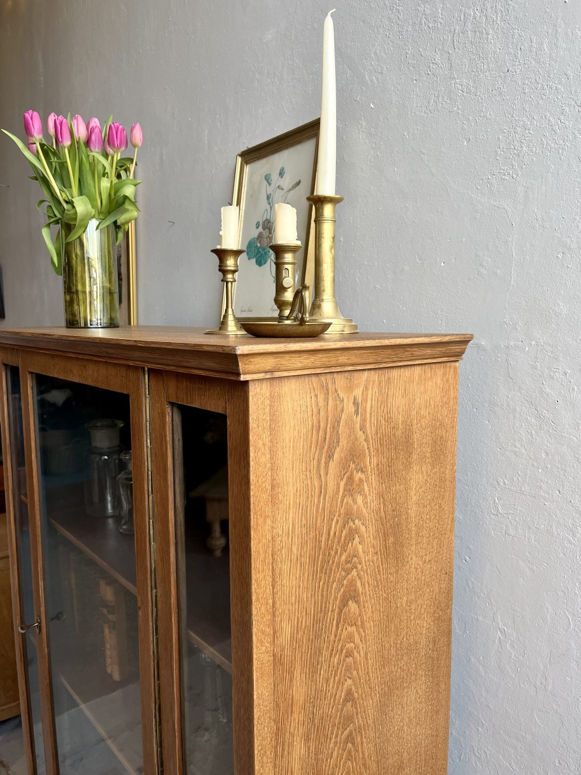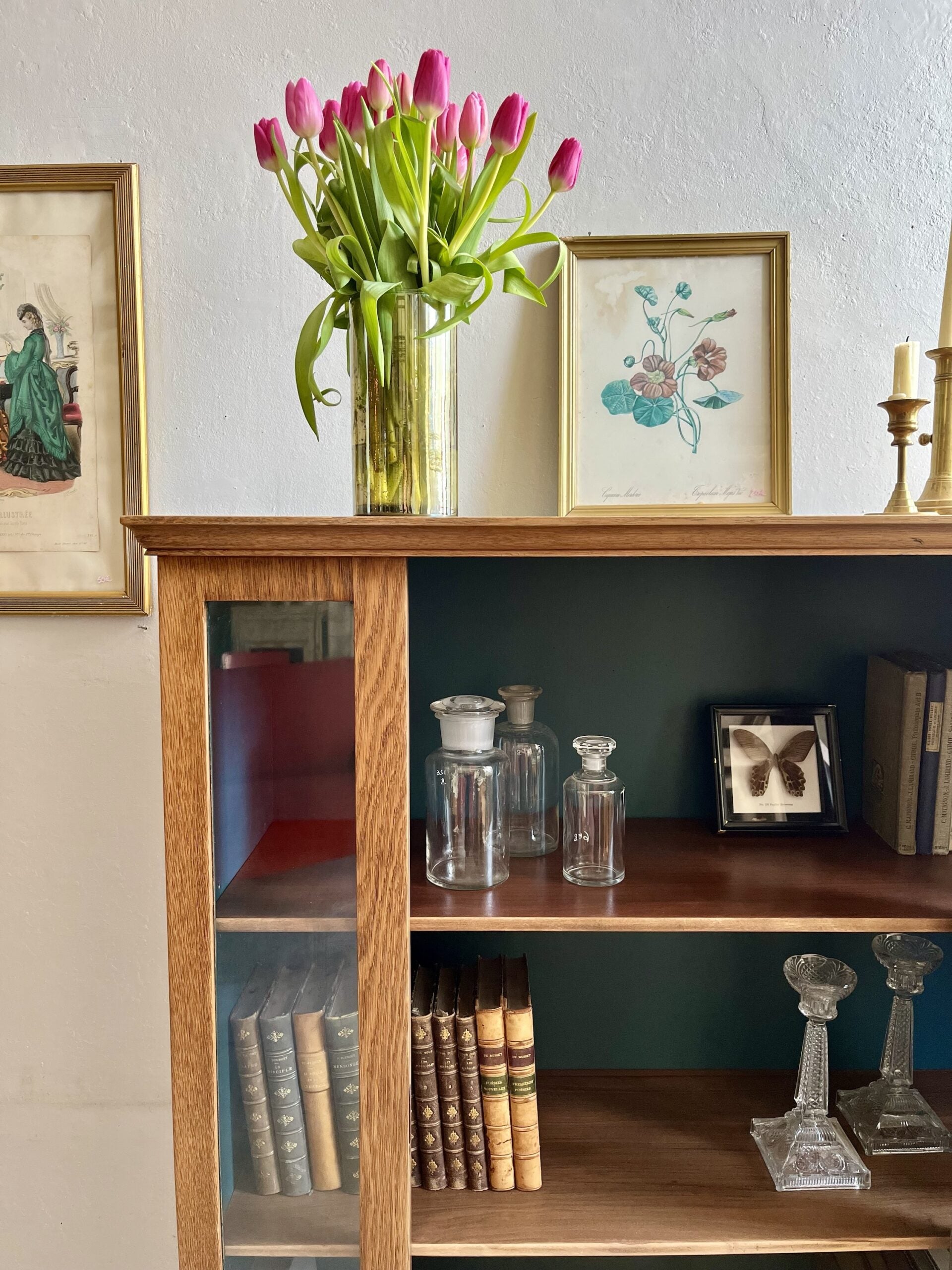 Vitrine ancienne remise au goût du jour tout en conservant son esprit d’origine. La teinte noisette réchauffe le bois et met en valeur son veinage, tandis que le bleu Terre de Fer à l’intérieur apporte de la profondeur et souligne les objets exposés. Jolie bibliothèque pour livres ou vitrine pour la vaisselle et les objets anciens. Un meuble qui trouve facilement sa place dans une pièce de vie en lui apportant une vraie identité.