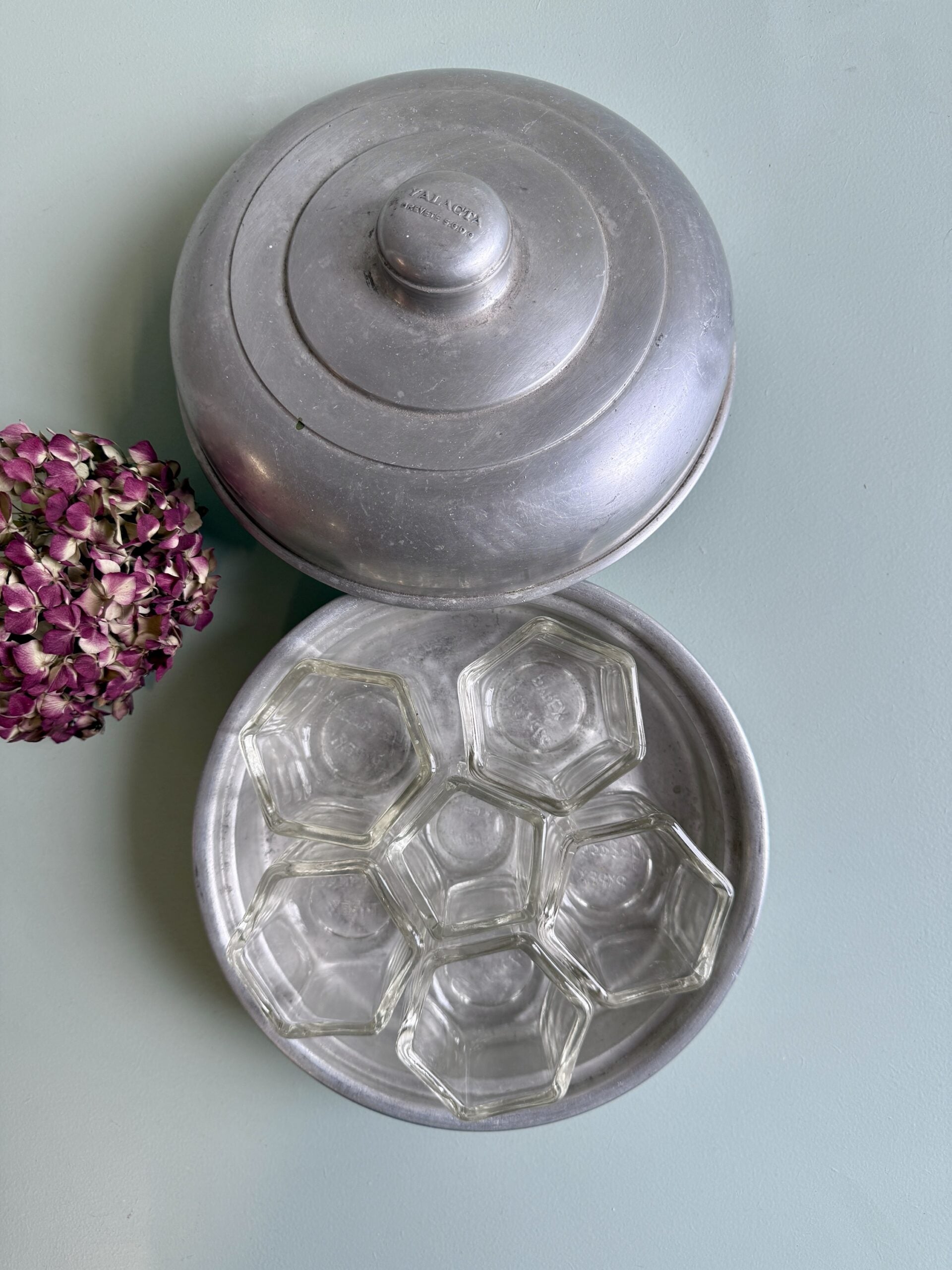 Ancienne yaourtière mécanique avec ses pots en verre, typique des appareils domestiques d’avant l’ère électrique. Ce modèle fonctionnait sans moteur ni électricité : les petits pots en verre étaient placés dans le conteneur métallique fermé, permettant au lait de fermenter lentement pour obtenir du yaourt maison. Ce principe a longtemps été utilisé avant l’apparition des yaourtières électriques modernes.Le métal du conteneur montre une patine cohérente avec l’âge de l’objet, et l’ensemble des petits pots en verre est complet, avec une variation de diamètre pour l’un d’eux.